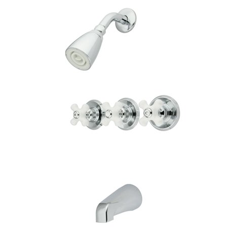 Kingston Brass KB232PX Magellan Tub and Shower Faucet with 3 Porcelain Cross Handles, Polished BrassKingston Brass KB232PX Magellan Tub and Shower Faucet with 3 Porcelain Cross Handles, Polished Brass Features:; Solid Brass Water Way Construction; 2.5 GPM/9.5 LPM@ 60 PSI; 6" Reach Shower Arm; 1/4 Turn Pressure Balanced Washerless Cartridge; IPS Connections; Polished Brass Finish; Porcelain Cross Handle; Premier Finish* Image shown may vary by color, finish, or material.../ Kingston Brass KB232PX Tub and Shower Faucet with 3-Cross Handle, Polished Brass / Brass Cross